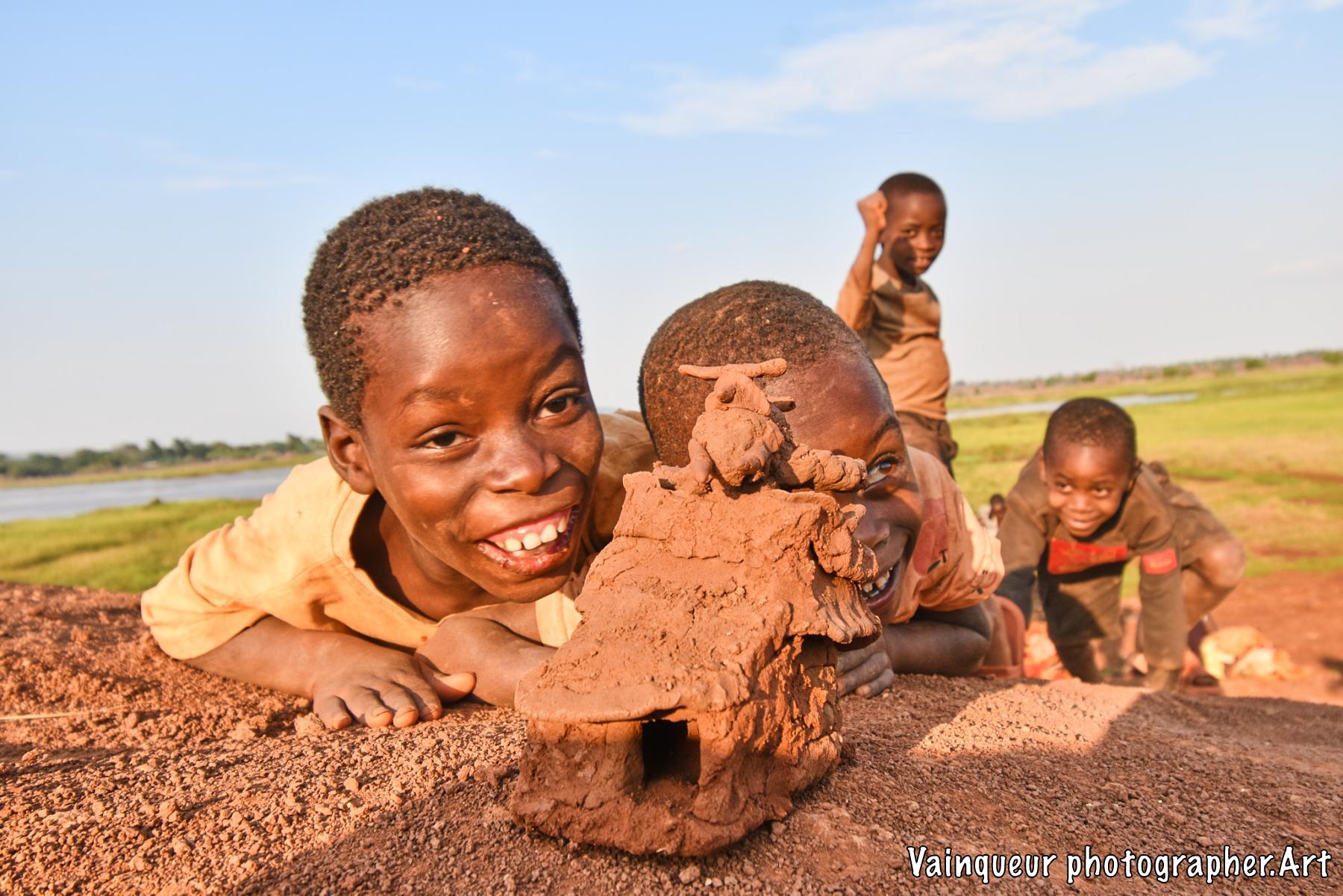 Somewhere in the village of Nyarugusu children relax and enjoy the fresh air in the sunshine near a stagnant pool of water.