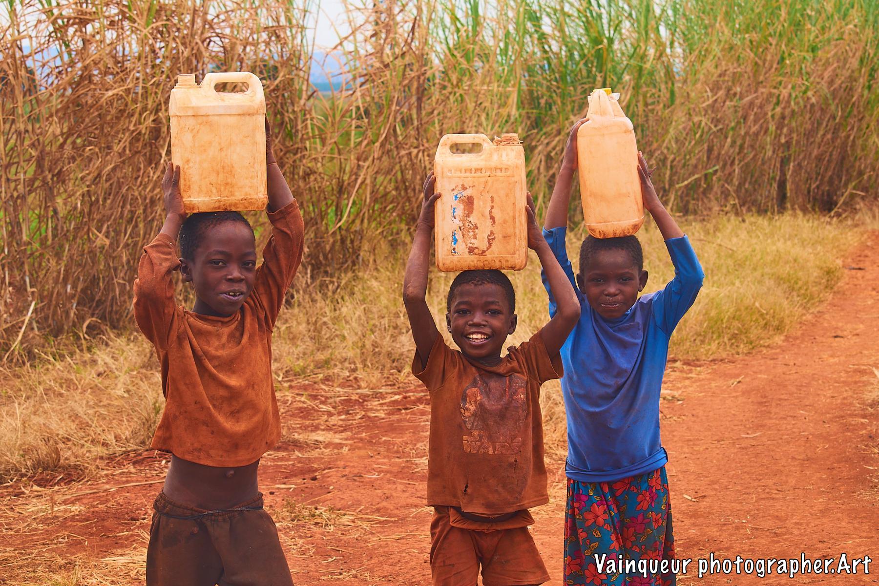 As I am always passionate about visiting African villages and bringing images of their daily lives, it was in the afternoon when I visited the refugee camp of Nyarugusu. When I arrived in a small bush in the middle of the garden I saw 3 refugee children running away in the mist, leaving their canister filling with water and escaping from me. I called them to join me and not to leave me, their big brother came to me saying "Oh you have the camera, we thought it's a gun ah haha".  Then they asked me how to handle the camera, I showed it to them and took pictures of each of them and finally they asked for a picture together.